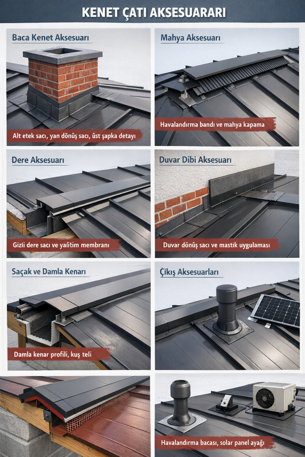 Kenet çatı sisteminde aksesuarlar, sistemin en kritik noktalarıdır. Çünkü sızıntıların %80’i genellikle aksesuar birleşimlerinden kaynaklanır.
