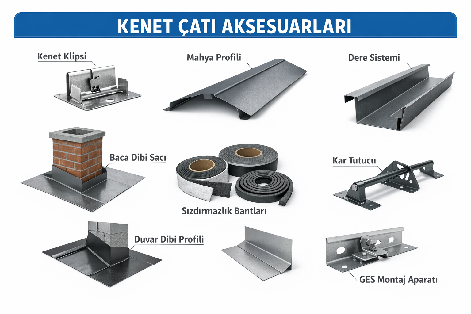 Bir kenet çatı sisteminin gerçek performansı panelden çok detay çözümlerinde ortaya çıkar. Aksesuarlar; su yalıtımı, rüzgar direnci, estetik ve uzun ömür açısından kritik rol oynar.