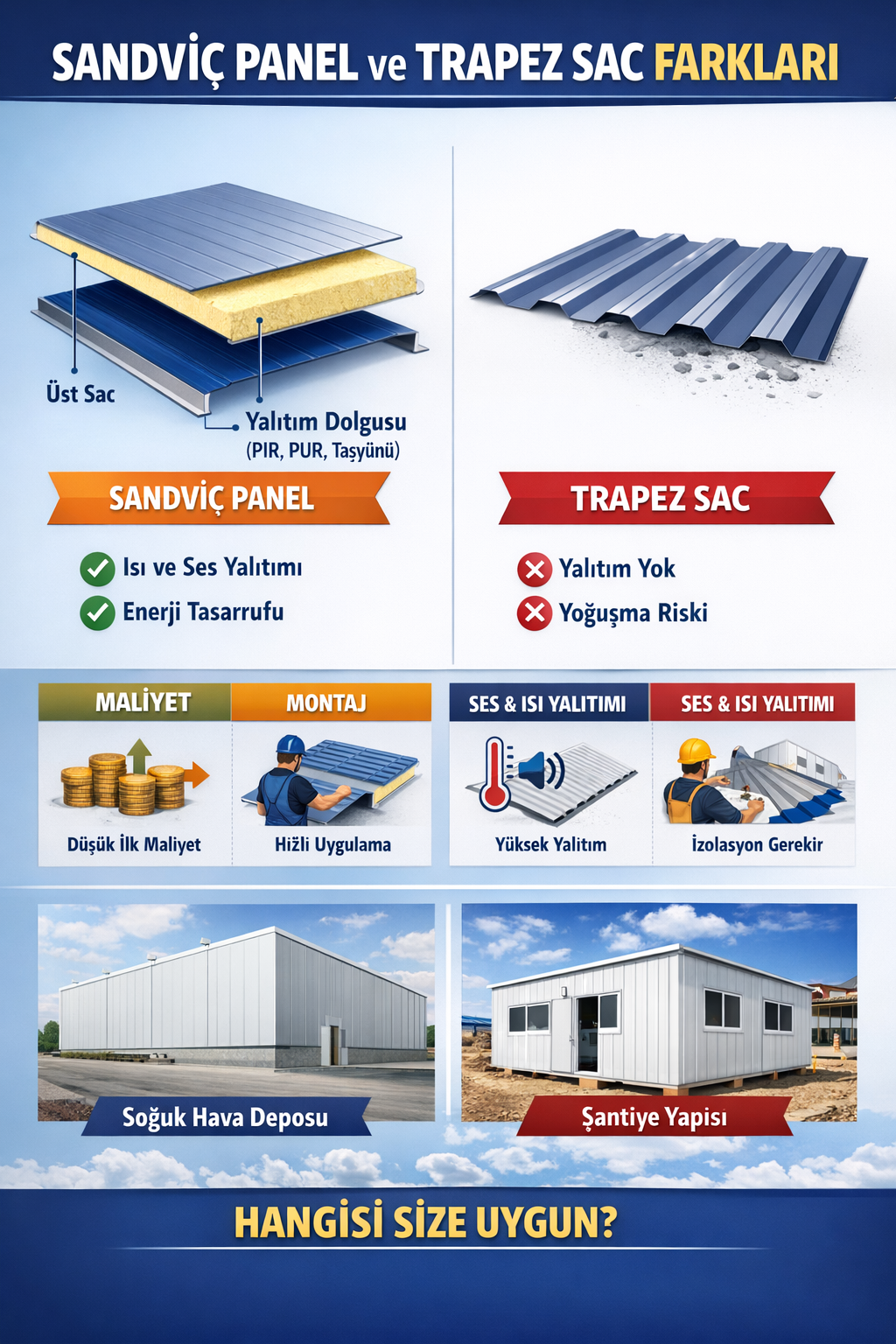 Sandviç panel ile trapez sac arasındaki en büyük fark yalıtımdır. Eğer yapı uzun süre kullanılacaksa ve enerji verimliliği önemliyse sandviç panel çok daha avantajlıdır. Ancak basit ve ekonomik çözümler için trapez sac tercih edilebilir.